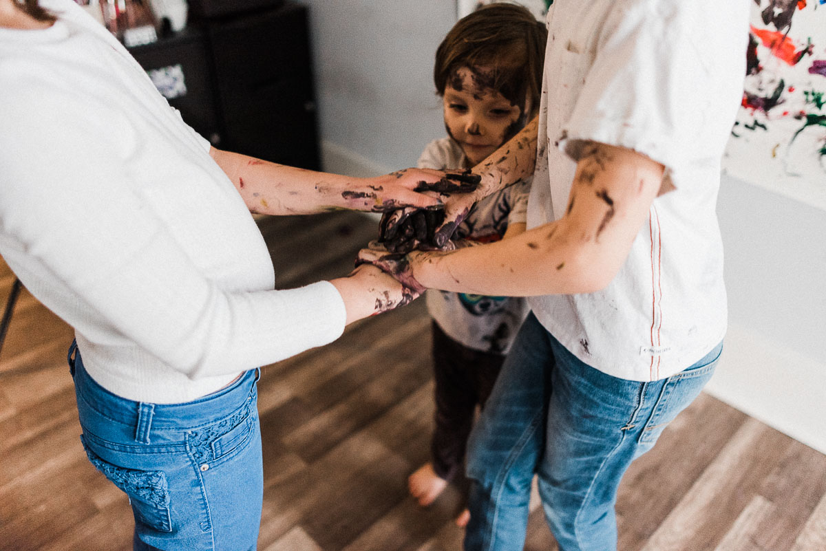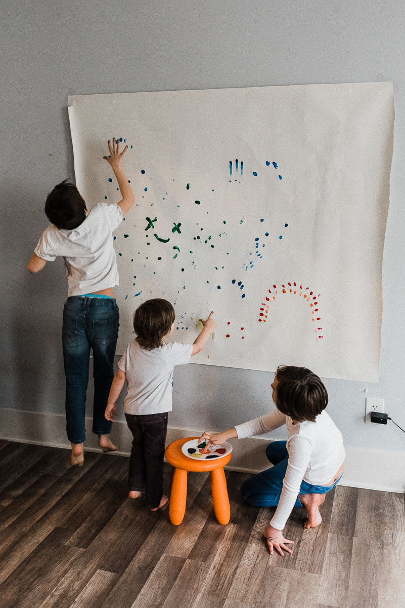 The past couple of weeks have been interesting, to say the least. The stay at home order is in full effect and we haven’t left the house in days. Being cooped up has ignited a level of energy in our children that could power a small country. Today we decided they needed a creative outlet to help them express everything they’ve been feeling. We shoved the kitchen table out of the way and kicked all of the legos aside. We got the paints down from the top of the fridge and popped them open. My husband told me I was crazy because the paint would end up everywhere. He was only partially correct. The blank canvas was then taped to the wall and ready to be decorated.